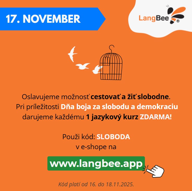 Pri príležitosti Dňa boja za slobodu a demokraciu venujeme každému 1 jazykový kurz v LangBee zdarma. Stačí v e-shope na www.langbee.app použiť kód SLOBODA.